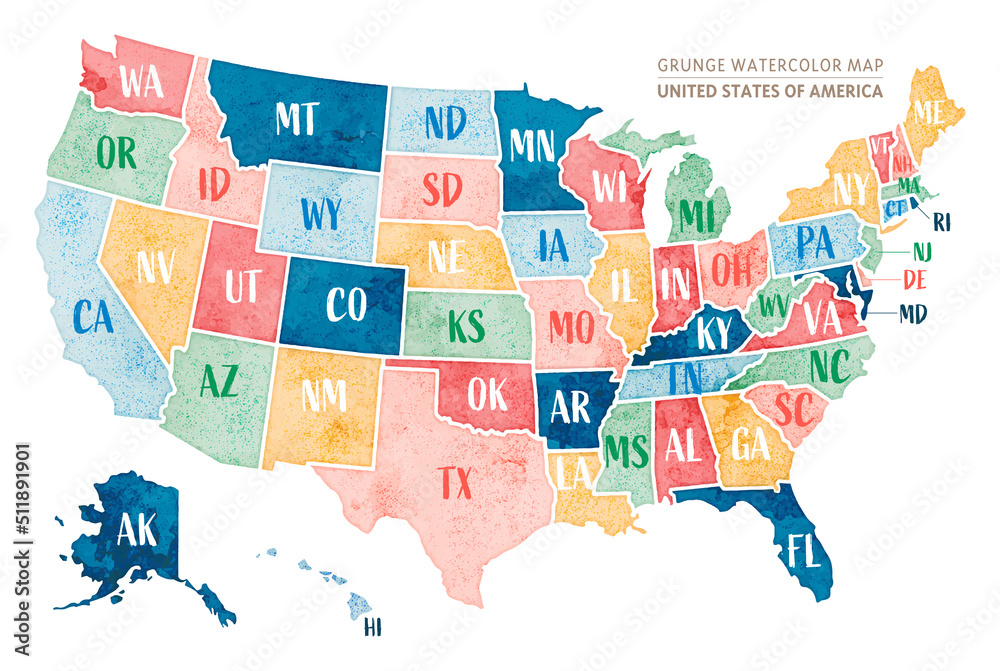 Emilie Taylor Art USA Watercolor Map, Watercolor US States