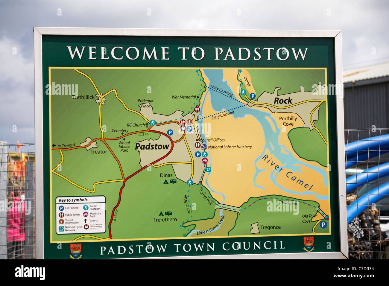 Welcome to Padstow sign with map at Padstow, Cornwall UK in May